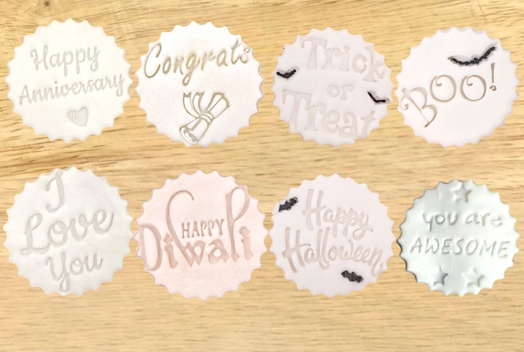 Happy Birthday • Thank You • Congrats! • Congrats (with graduation scroll) • Happy Anniversary • Happy Diwali • I Love You • Happy Halloween • You Are AWESOME • Bride Tribe • Sorry You’re Leaving • Mum • Oh Baby (with babygrow) • Merry Christmas • BOO! (with bat) • Trick or Treat (with bats) • Or a short personalised message (character limit applies – see example image).