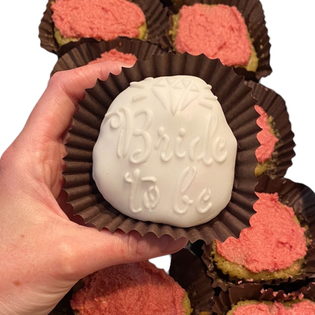 Indulge in the sweet goodness of our Vegan Rustic Cupcakes, topped with a Fondant Message of your choice!