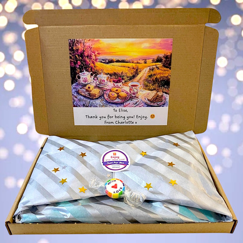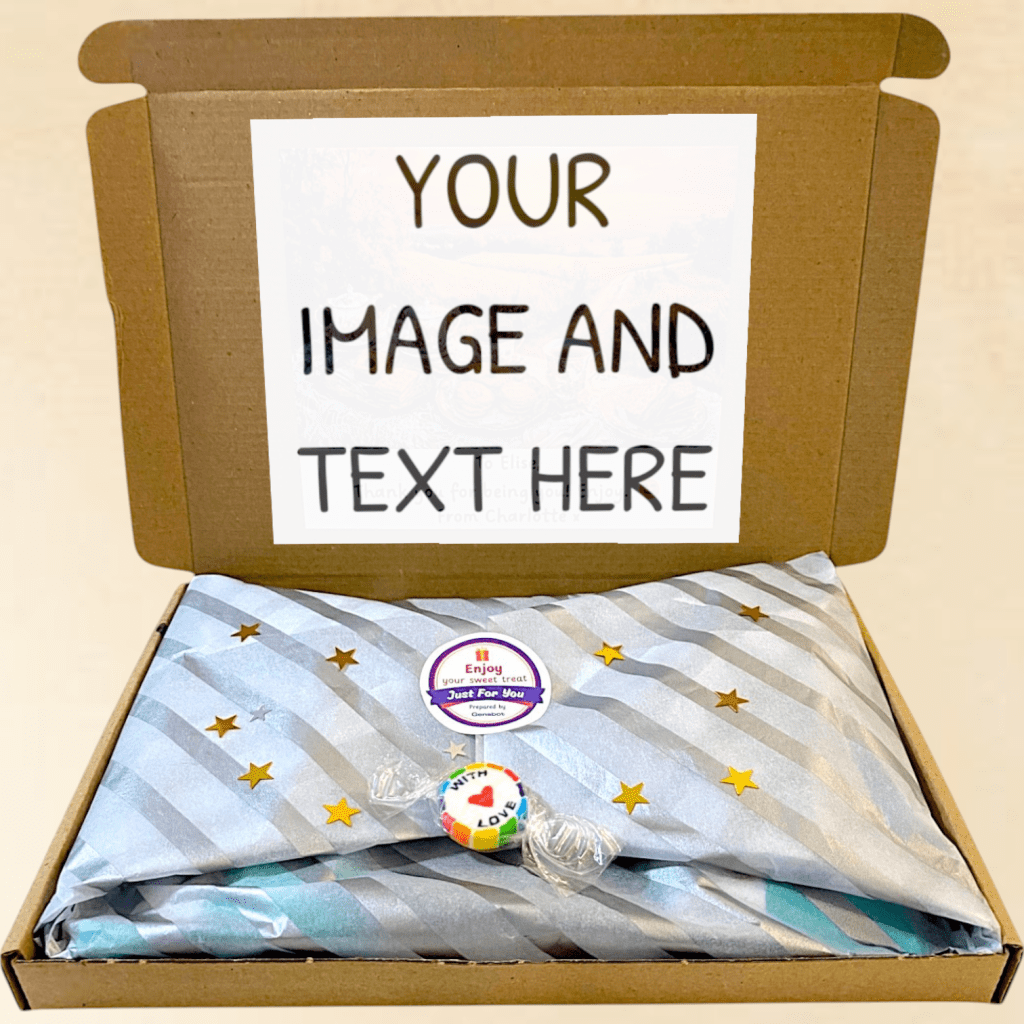 Further to custom text, we also offer a custom image imagined up by you for inside the box. Simply describe the image you want at check out and see it come to life as you unwrap your letterbox treat.