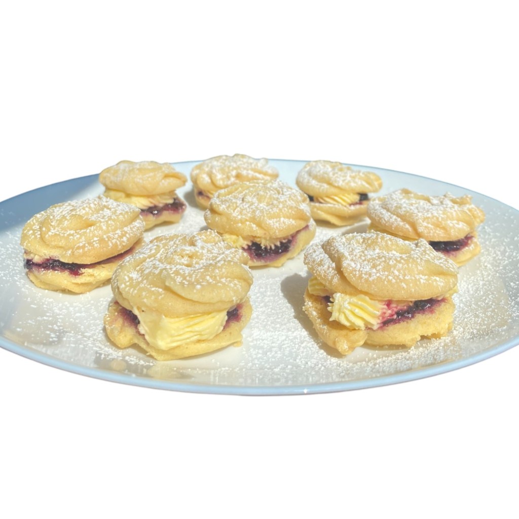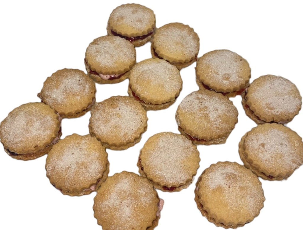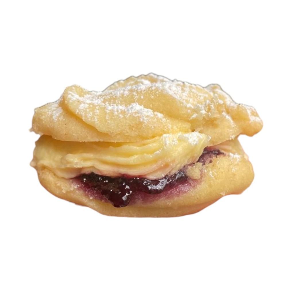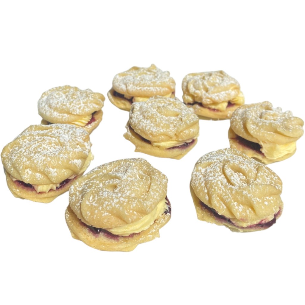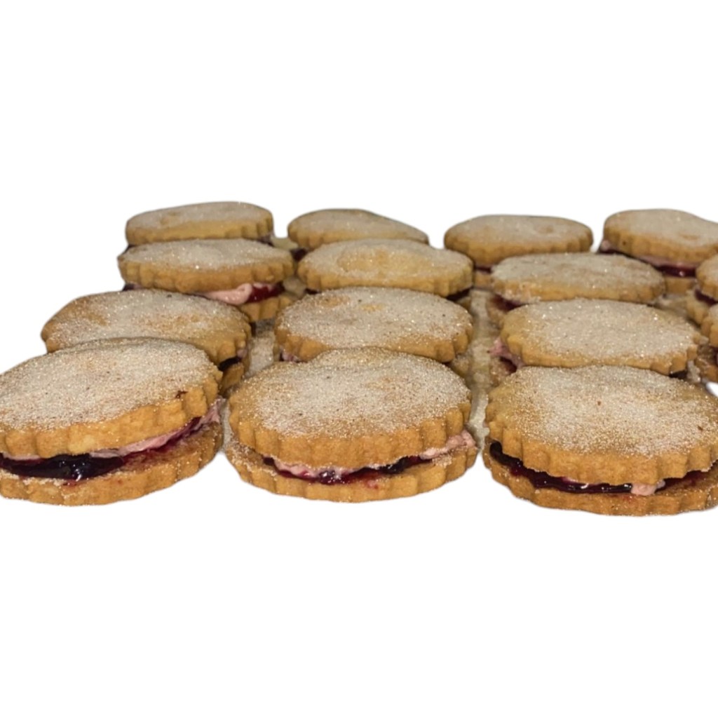 Indulge in the buttery goodness of our Large Jam ‘n’ Buttercream Shortbread Cookie Sandwiches! Buttery shortbread rounds filled with whipped buttercream and a gleaming fruity conserve centre that shines through a heart window.